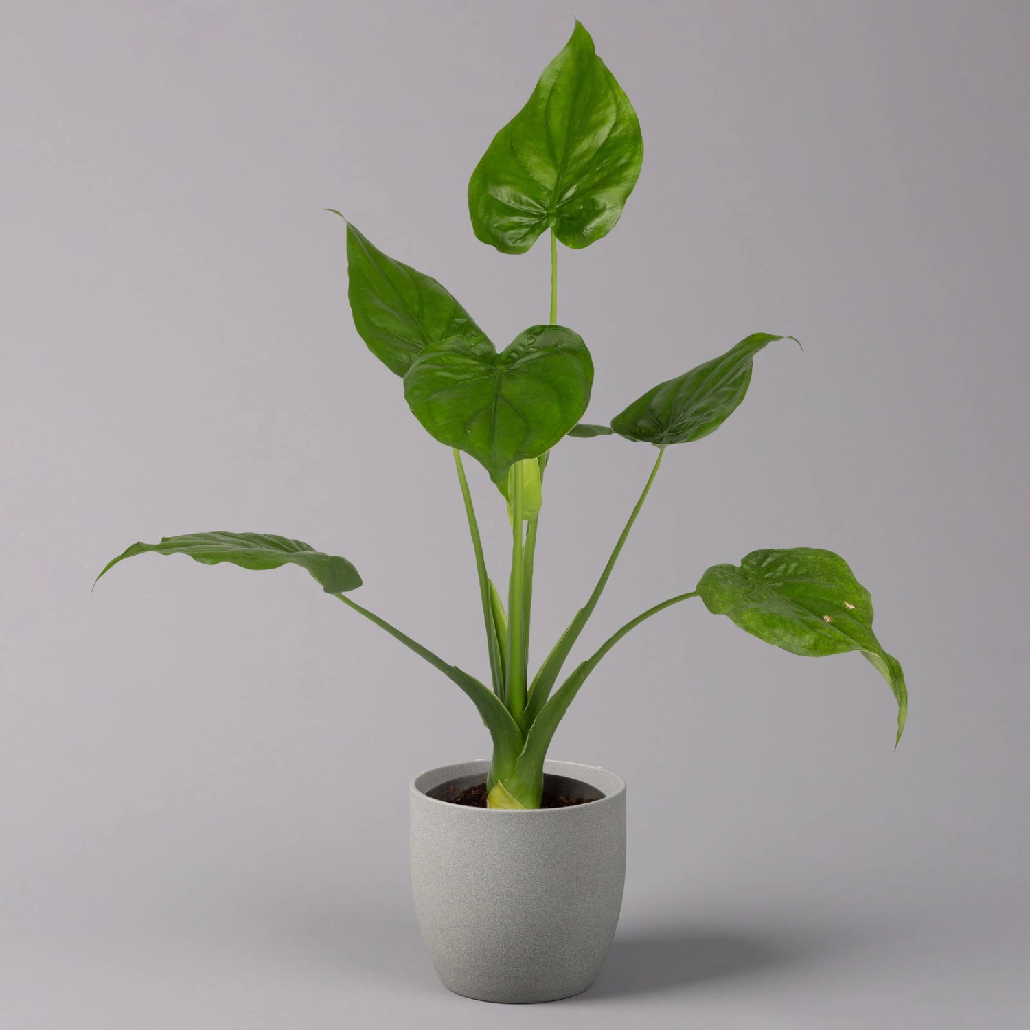 Das Kupfer-Pfeilblatt (Alocasia ‚Cucallata‘), auch unter den Namen Alokasie oder Elefantenohr bekannt, ist eine prächtige Blattschmuckpflanze, welche ursprünglich aus dem tropischen asiatischen Raum stammt und besonders durch die großen, oft kontraststarken Blätter überzeugt. Charakteristisch für die Alocasia ‚Cucallata‘ sind die geäderten, gleichmäßig sattgrünen, herzförmigen Blätter. Die Pflanze zählt zur Familie der Aronstabgewächse und am Naturstandort werden Pfeilblätter bis zu 8 Meter groß, in der Wohnung erreichen nur wenige Arten Höhen von mehr als 1 Meter.