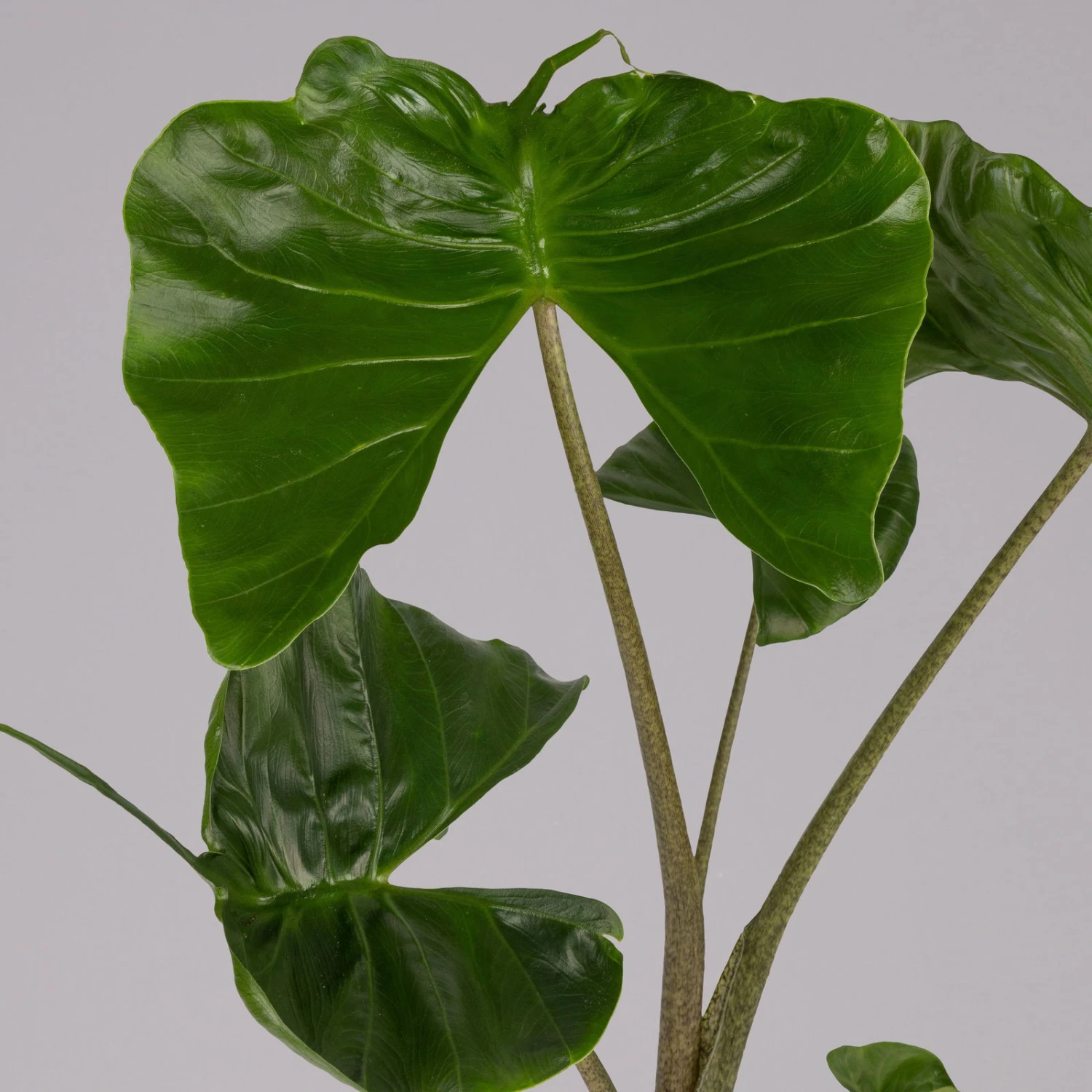 Das Pfeilblatt (Alocasia macrorrhiza ‚Stingray‘), auch unter den Namen Alokasie oder Elefantenohr bekannt, ist eine prächtige Blattschmuckpflanze, welche ursprünglich aus dem tropischen asiatischen Raum stammt und besonders durch die großen, oft kontraststarken Blätter überzeugt. Charakteristisch für die Alocasia macrorrhiza ‚Stingray‘ sind die sattgrünen, herzförmigen, spitz zulaufenden Blätter, die an einen Stachelrochen (‚Stingray‘) erinnern. Die Pflanze zählt zur Familie der Aronstabgewächse und am Naturstandort werden Pfeilblätter bis zu 8 Meter groß, in der Wohnung erreichen nur wenige Arten Höhen von mehr als 1,50 Metern.