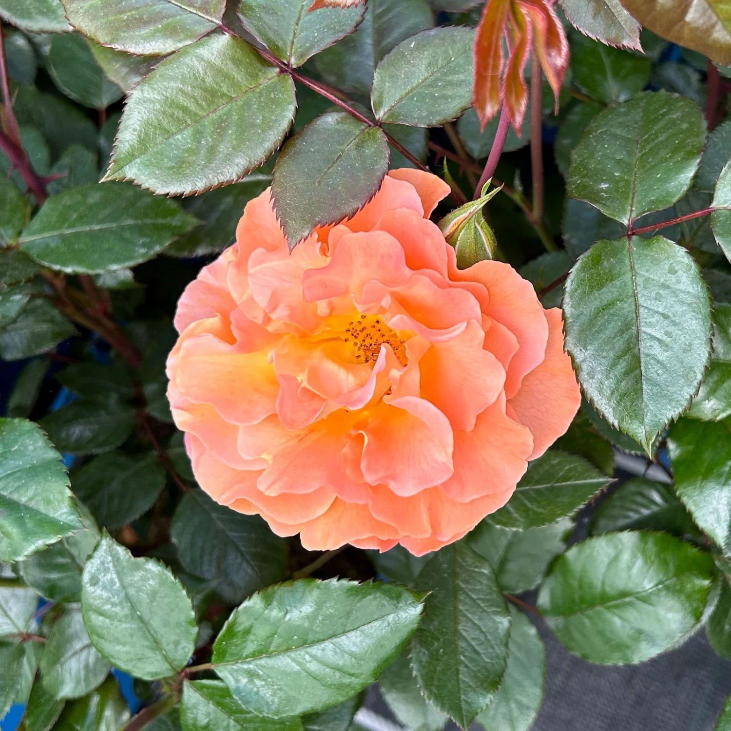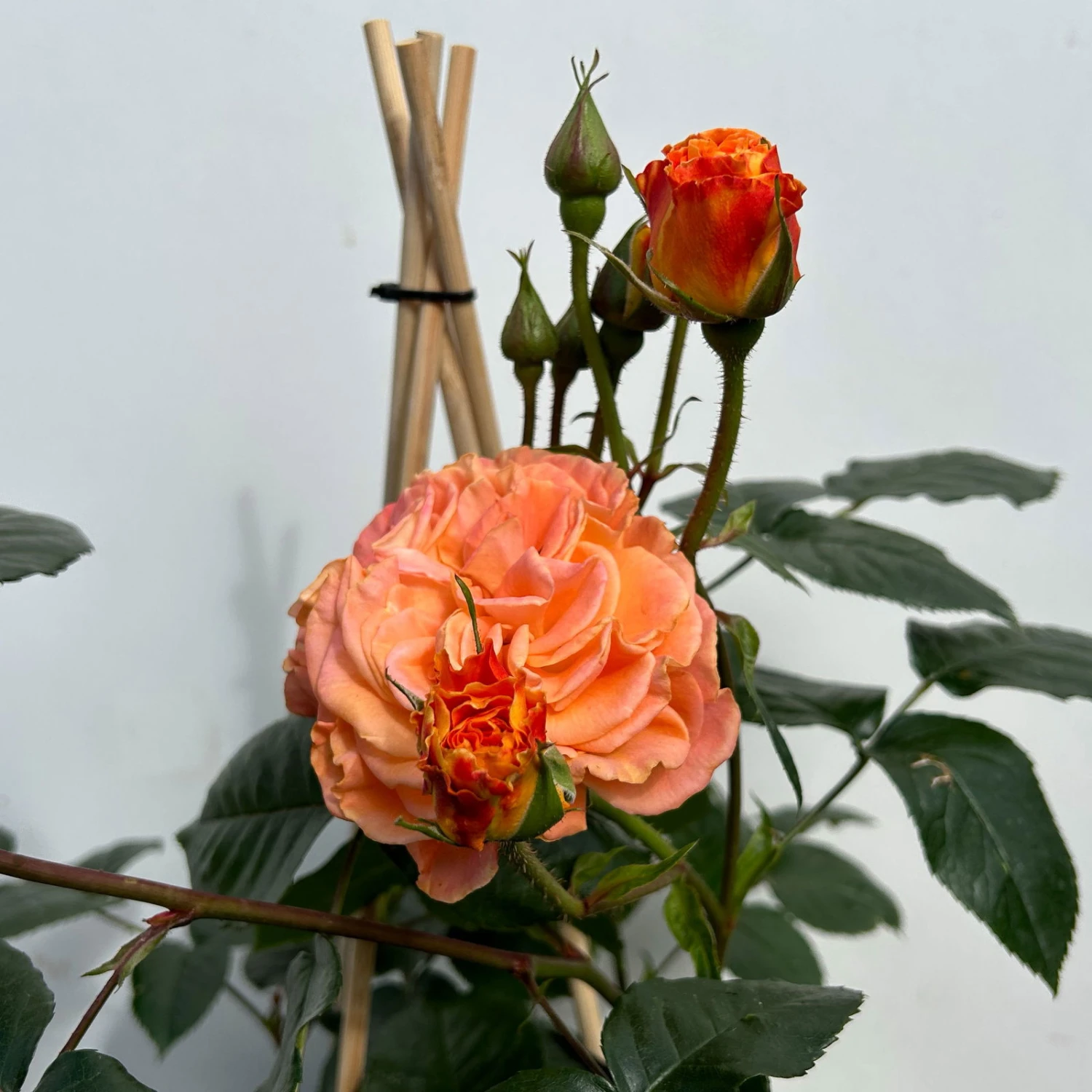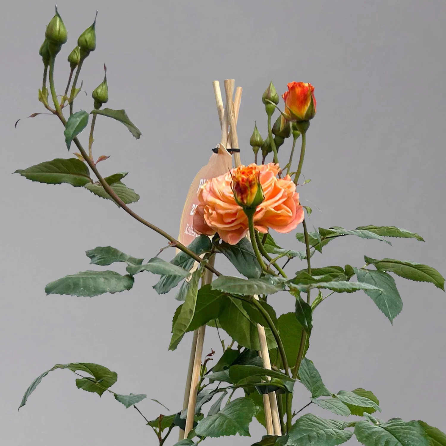 Auffällige Beetrose mit halbgefüllten, wunderschönen Blüten, die mit einem interessanten Farbspiel von orange über aprikot bis hin zu rosa überraschen. Dunkelgrünes, glänzendes Laub unterstützt die besondere Leuchtkraft der Blüten und macht die öfterblühende Beetrose ‚Westzeit®‘ zu einem besonderen Blickfang mit guter Fernwirkung.