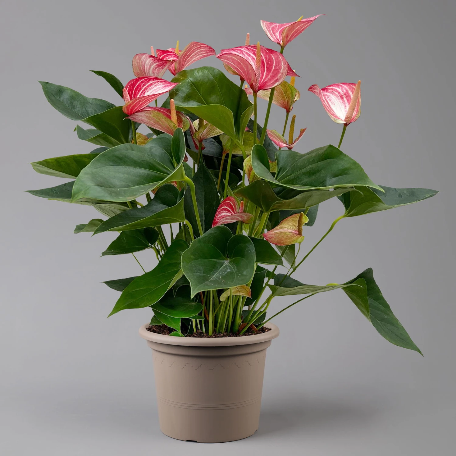 Die besonderen, farbigen Hochblätter der Flamingoblume (Spatha) werden oft fälschlicherweise für die Blüten der Pflanze gehalten. Wie bei den meisten Pflanzen der Familie der Aronstabgewächse sitzt die eigentliche, kolbenartige, gelbliche Blüte in der Mitte der Hochblätter und ist eher unscheinbar. Das interessante rot-weiß gestreifte Hochblatt ist der Hauptblickfang und bringt Farbe in Ihr Zuhause. Die Flamingoblume treibt das ganze Jahr hindurch immer wieder neue Blüten aus, die bis zu 3 Monate am Stück stehen.