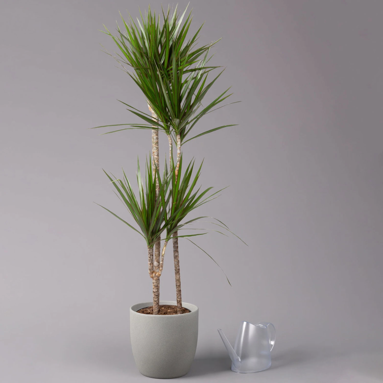 Sie erhalten die beliebte Dracaena marginata für eine besonders abwechslungsreiche Optik in einem 3er-Tuff. Ob als immergrüner Solitär oder stimmiges Element Ihres durchdachten Begrünungskonzepts – eine Dracaena macht sowohl im Büro als auch in privaten Räumen eine gute Figur. Dabei ist Ihr Drachenbaum nicht nur eine dekorative Zimmerpflanze, sondern auch ein natürlicher Luftraumfilter und zuverlässiger Sauerstofflieferant. Vor allem in Räumen mit belasteter Luft wie Küchen und Büros, Cafés oder Raucherwohnungen sorgt die Dracaena marginata für eine Wohlfühlatmosphäre. Als vorteilhaft erweist sich der geringe Pflegeaufwand, denn ein Drachenbaum braucht relativ wenig Wasser und gedeiht in hellen oder halbschattigen Lagen gleich gut.