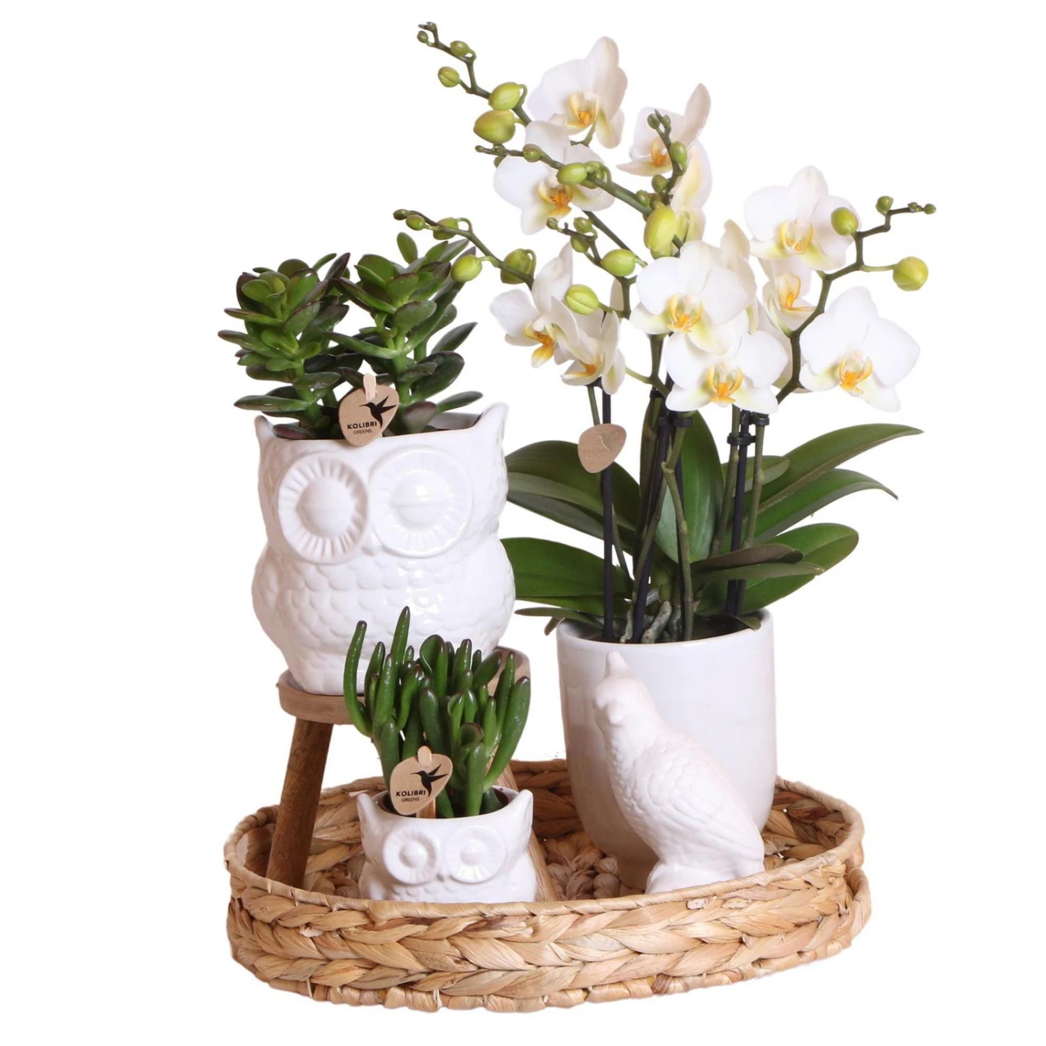Dann werden Sie mit unserem wunderschön naturalen Geschenkset fündig! Das Geschenkset besteht aus einer filigranen weißen Orchidee und zwei pflegeleichten Sukkulenten, jeweils im dekorativen Keramiktopf und inklusive Tablett und liebevoll gestalteter Dekofigur. Das Set wurde bereits farblich perfekt aufeinander abgestimmt, sodass Sie ihr neues Dekostück sofort genießen können und sich nicht mit dem Zusammenstellen auseinandersetzen müssen. Egal ob auf dem Tisch, auf der Fensterbank oder als Hingucker direkt im Eingangsbereich: Das trendige Geschenkset macht überall eine gute Figur und überzeugt in zurückhaltendem Weiß.