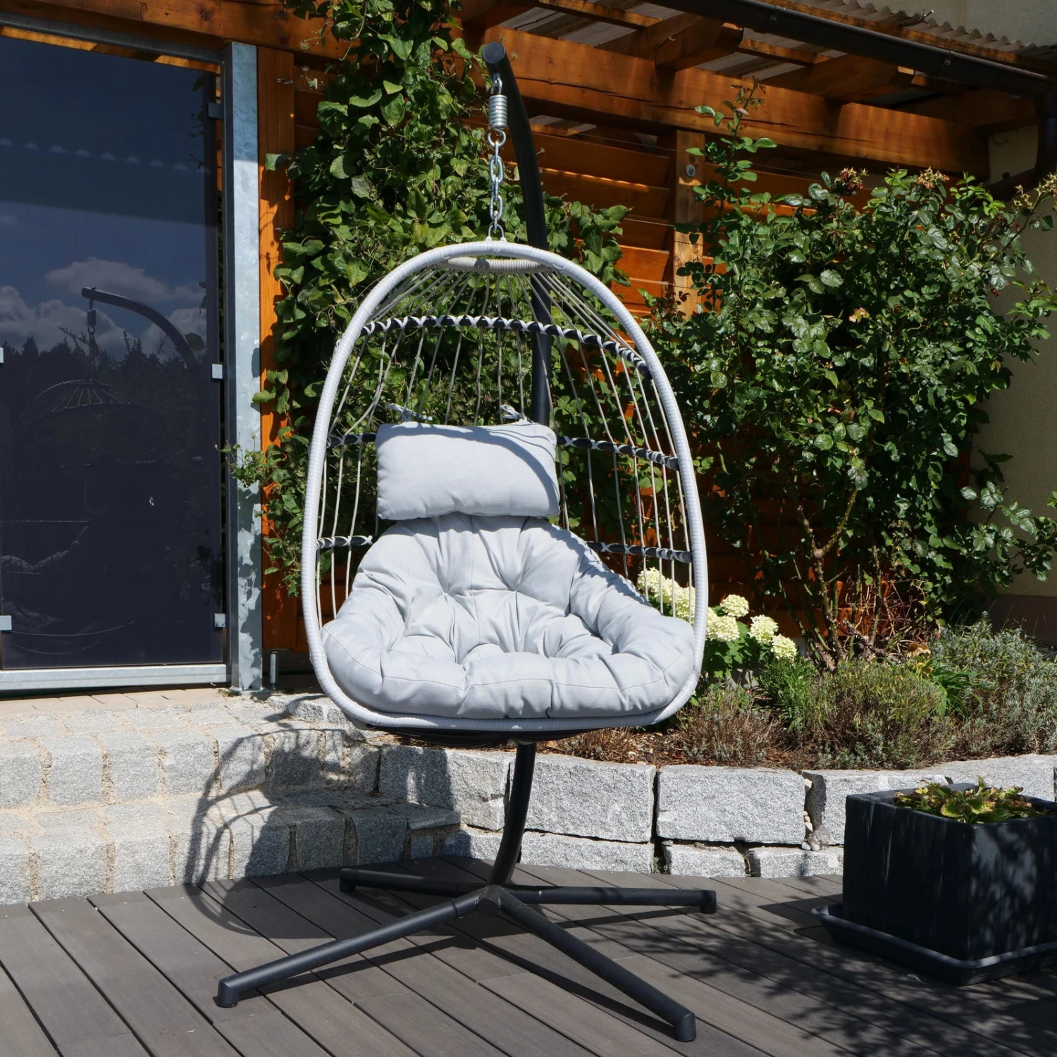 Lassen Sie sich nieder und schaukeln Sie sich in sanfte Träume ein. Der Hängesessel ‚Folt Sterzing‘ in Blaugrau ist eine Einladung zum Ausruhen und Entspannen. Sie erhalten diesen Hängesessel inklusive eines stabilen Gestells und einer weichen Polsterauflage. Das Gestell hält Belastungen von bis zu 130 Kilogramm stand und ist kippsicher. Falls Sie das Möbelstück gerade nicht brauchen, klappen Sie den Hängesessel ‚Folt Sterzing‘ mit wenigen Handgriffen zusammen.