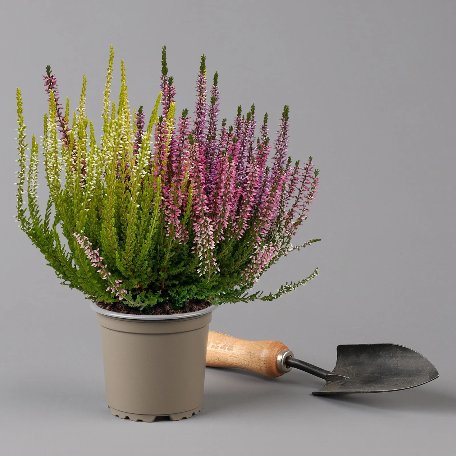 Die kleinen Blüten erscheinen bei der Knospenheide nur, wie der Name erahnen lässt, als Knospen und blühen nicht auf. Dadurch kann ihnen weder Wind noch Regen etwas anhaben und die farbigen Knospen bleiben bis in den Winter hinein schön. Die Calluna vulgaris ‚Starlight® Milca-Trio‘ ist ein Topf, in dem 3 verschiedenen Sorten Knospenheide zusammen kultiviert wurden. Die Calluna vulgaris ‚Starlight® Milca-Trio‘ bringt durch die Farben lila, rot & weiß mit gelben Laub oder lila, rot & weiß Abwechslung in Ihre Bepflanzung.