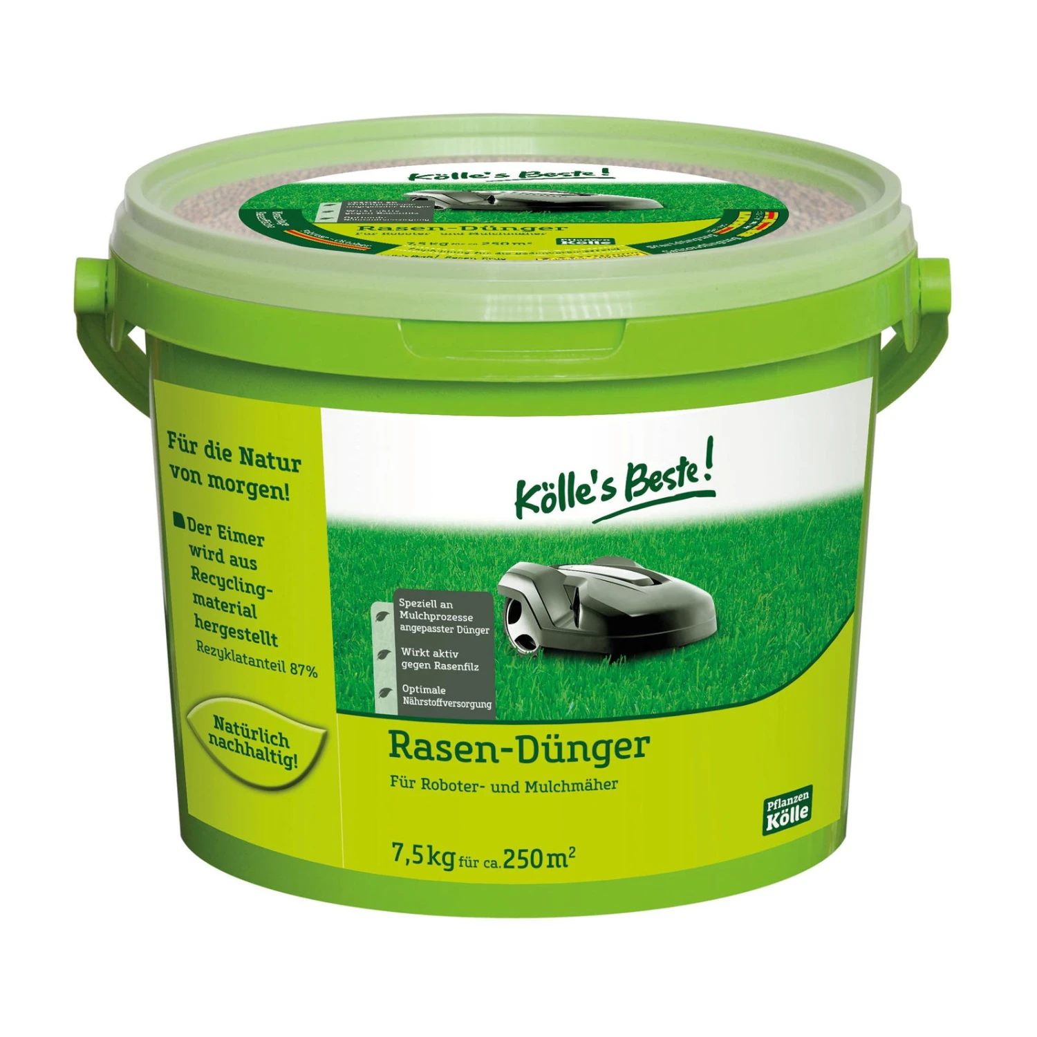 Kölle’s Beste Rasendünger für Roboter- und Mulchmäher sorgt durch die spezielle Nährstoffkombination für eine schnelle Regeneration des Rasens und einen raschen Narbenschluss nach dem Mähen.