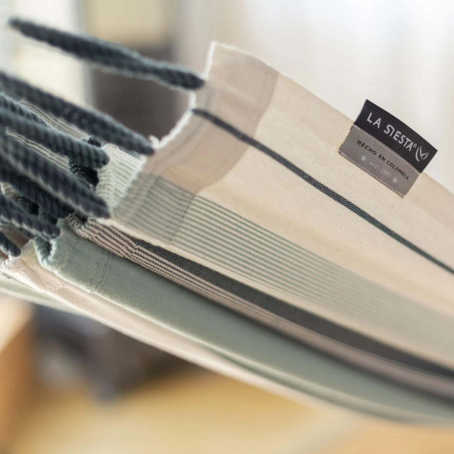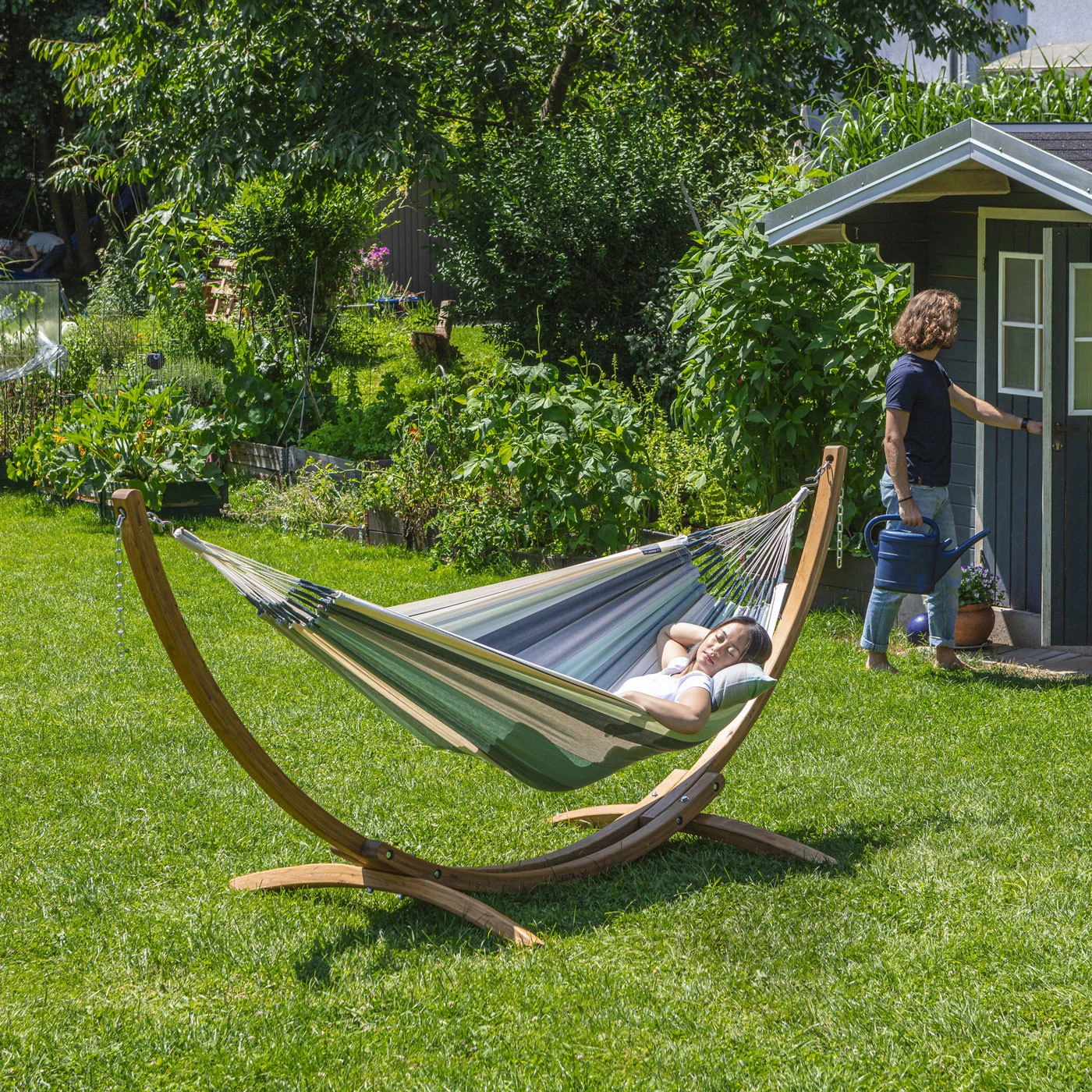 Ein wunderschönes Gefühl der Schwerelosigkeit erleben Sie in der gemütlichen Single Hängematte ‚Modesta‘. Sie ist aus Bio-Baumwolle gefertigt, die besonders lange Fasern hat und der Hängematte eine hohe Reißfestigkeit verleiht. Dieses beige-grüne Modell mit den Maßen 300 x 140 cm ist bis 120 kg belastbar.