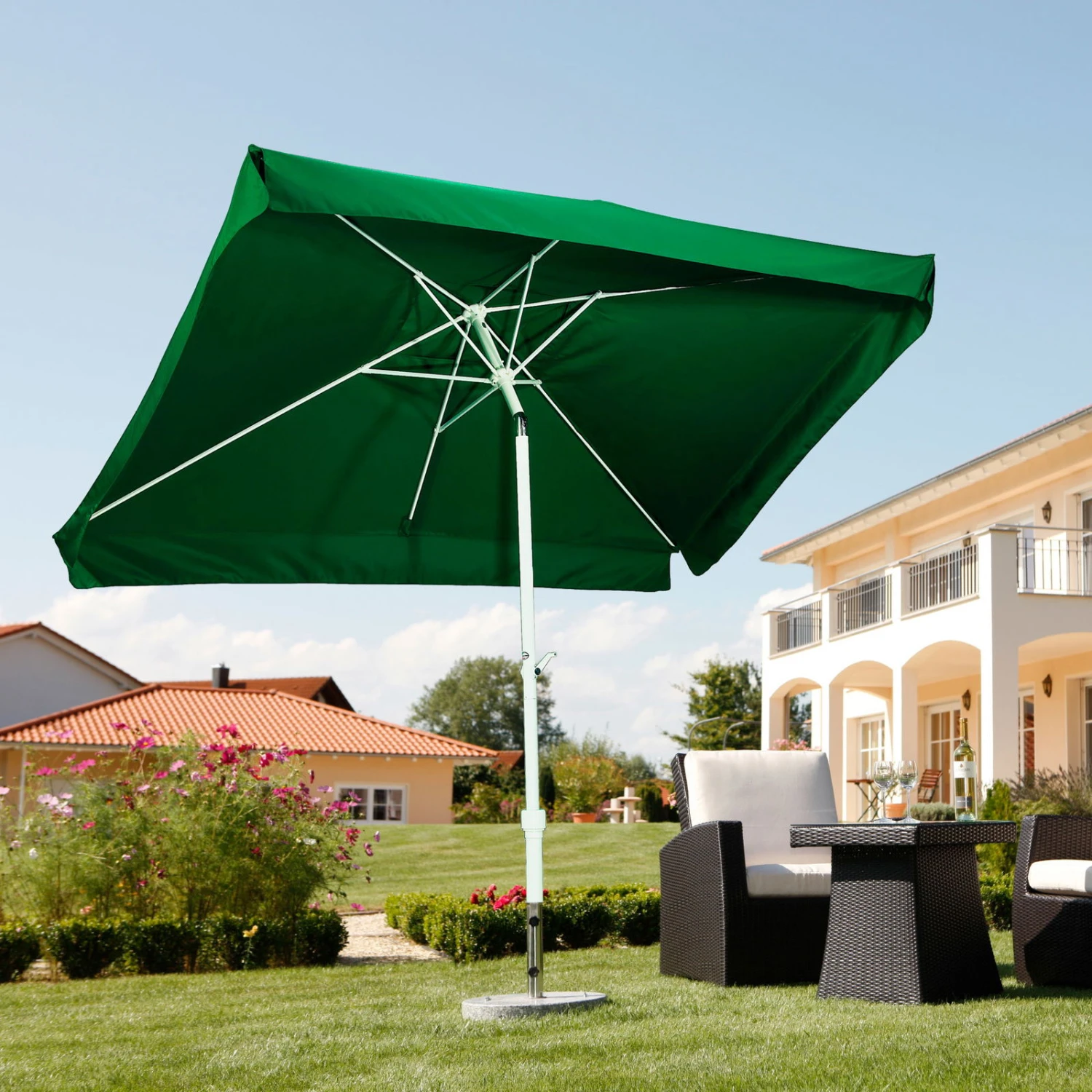 Der Mittelstockschirm ‚Oslo‘ von Schneider in freundlichem Grün fügt sich problemlos in jede Outdoor-Landschaft ein und spendet großzügig kühlen Schatten. Dank einer durchdachten Konstruktion ist es kein Problem, den Sonnenschirm an den aktuellen Sonnenstand anzupassen. Zu den weiteren Vorteilen gehört eine pflegeleichte, wasserabweisende, imprägnierte und verrottungsfeste Polyester-Bespannung.