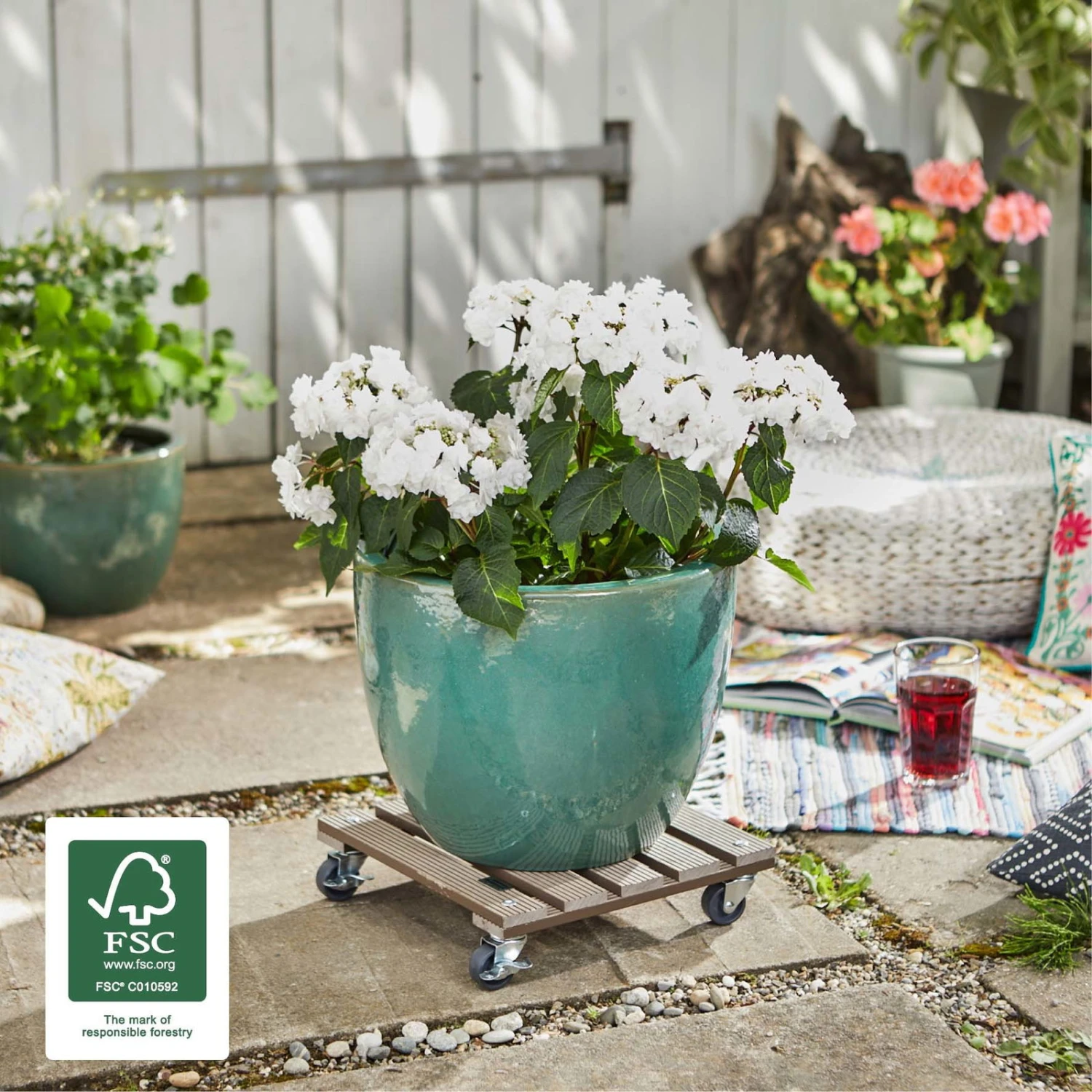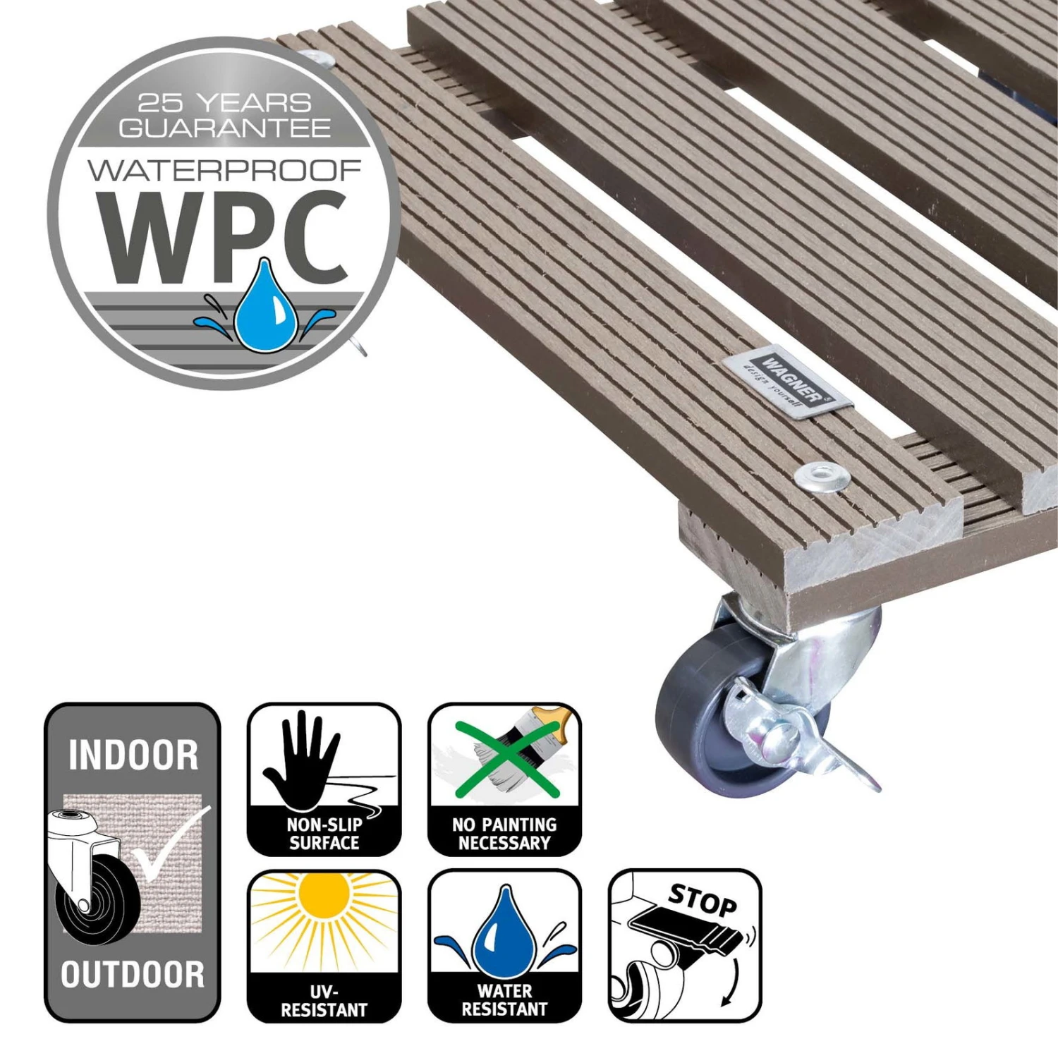 Die Tragfläche dieses Multi Rollers besteht aus strapazierfähigem Verbundstoff Wood-Plastic-Composite in ansprechender Holzoptik in der Farbe Taupe. Das innovative Material hält hohen Belastungen stand, ist wasserabweisend, formstabil und außerdem farbecht. Für dauerhaften Einsatz outdoor ist der Multi Roller WPC somit die richtige Wahl.