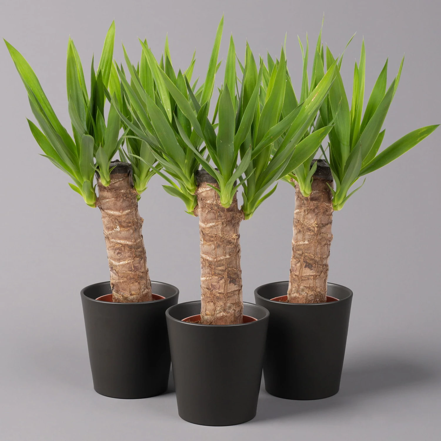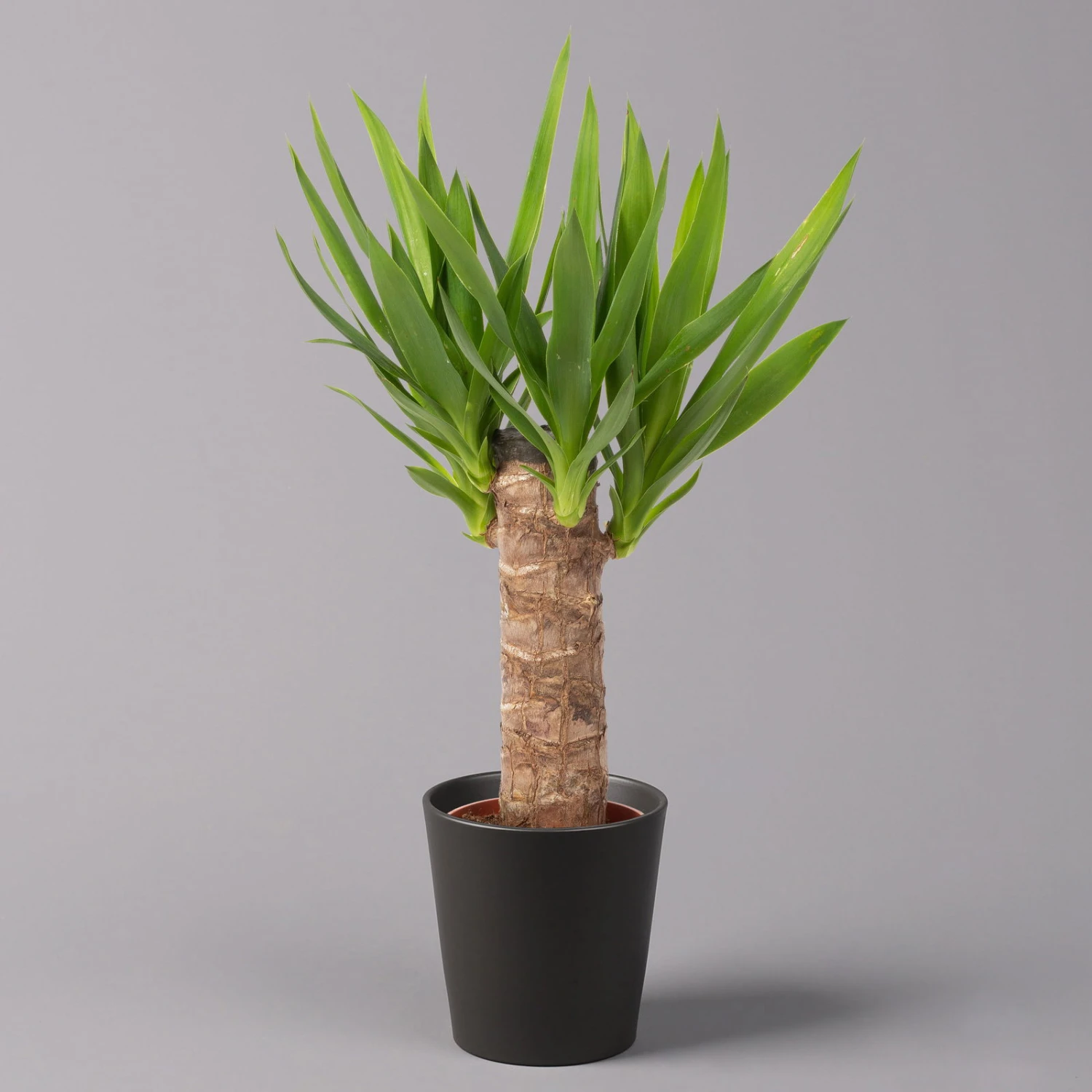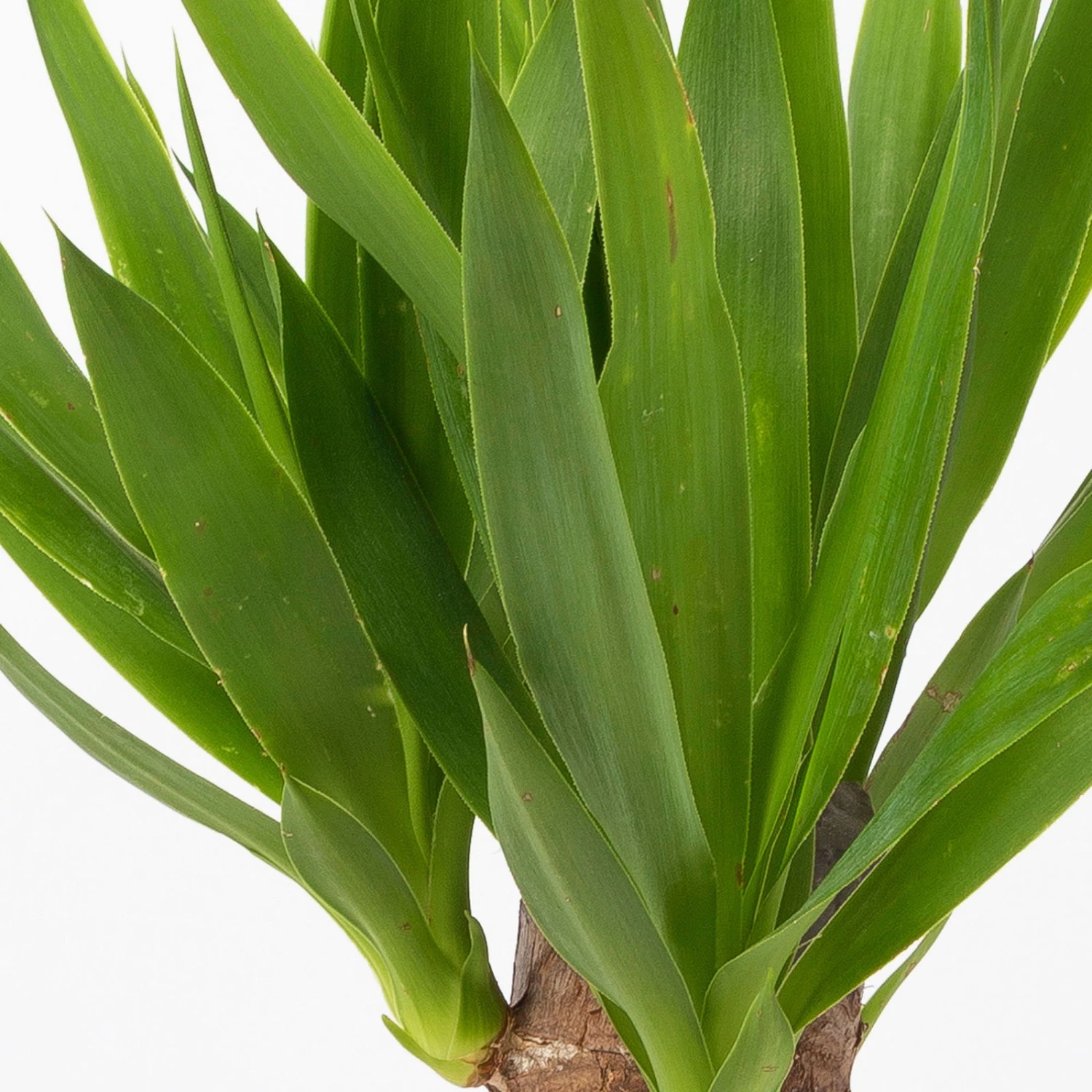 Ein exotischer Klassiker unter den Zimmerpflanzen ist die Palmlilie (Yucca elephantipes). Die hübsche Raumpflanze aus der mexikanischen Tropenregion ist dank ihrer leichten Pflege auch hierzulande sehr beliebt und eignet sich für Schlafzimmer, Wohnräume, Treppenhäuser oder Büros. Bei Pflanzen-Kölle können Sie die Trendpflanze Palmlilie kaufen und in einem geeigneten Blumenkübel an einem hellen und sonnigen Standort auf der Fensterbank oder auf einem Pflanzentisch platzieren. Damit die unter dem botanischen Namen bekannte Yucca elephantipes, oder auch Yucca-Palme genannt, optimal wächst und gedeiht, braucht die Pflanze ausreichend Sonnenlicht, da das Wachstum ansonsten stark bis ganz beeinträchtigt wird. Mit ihren hellgrünen und schlanken Blättern ist die Palmlilie eine schicke Zierpflanze. Für die Pflege der Pflanze reicht mäßiges Gießen, einen zu nassen Boden sollten Sie unbedingt vermeiden und die Palmlilie erst wieder gießen, wenn die Erdoberfläche abgetrocknet ist. Bitte stellen Sie Ihre Yucca außerhalb der Reichweite von Kindern oder Hautieren auf, da sie giftig ist und die scharfkantigen Blättern zu Verletzungen führen können.