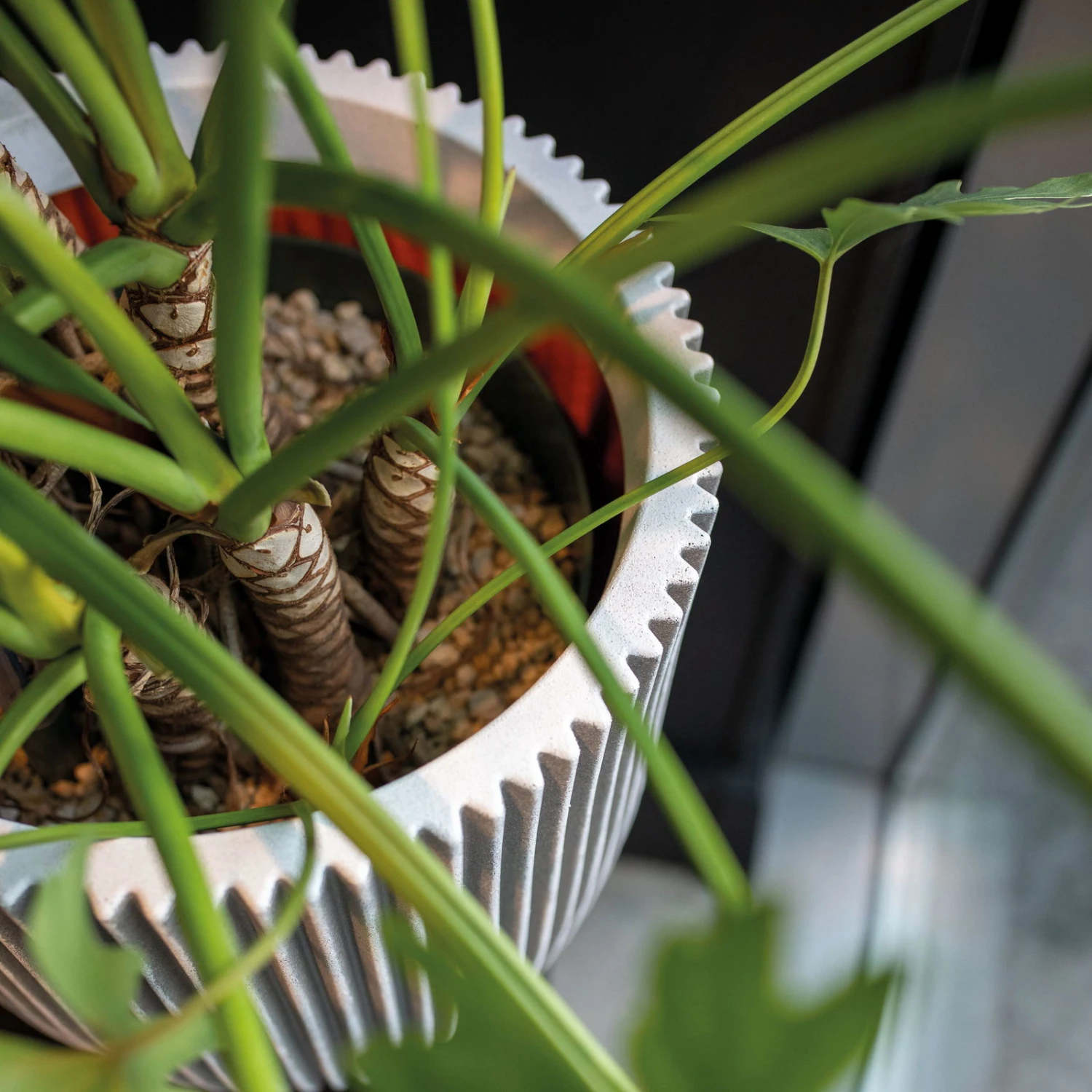 Die Pflanzvase ‚Groove‘ von Capi Europe besteht aus recyceltem Kunststoff und besticht durch eine elegante Linienführung. Die Innenschicht in Orange setzt einen Kontrastpunkt zum edlen Elfenbein der Oberfläche und macht die Pflanzvase bruchfest sowie wärmedämmend. Das frostbeständige und UV-resistente Material sorgt dafür, dass dieses Pflanzgefäß für den Dauereinsatz draußen geeignet ist.