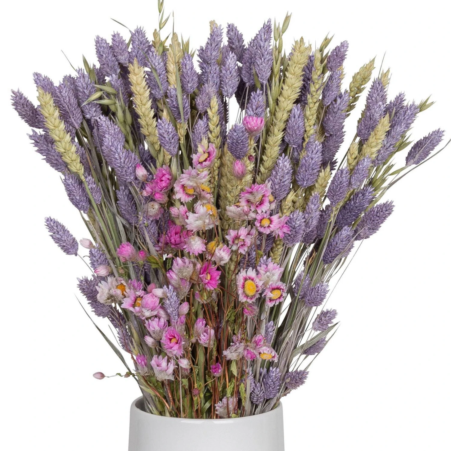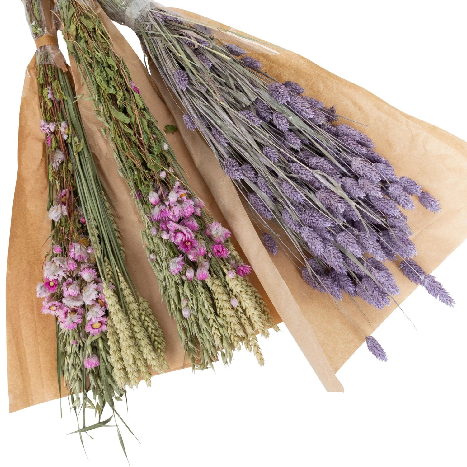 Für dieses trendige Set wurde ein Bund lilafarbenes Glanzgras mit zwei Trockensträußen aus Hafer, Weizen und Rhodante in Rosa kombiniert.