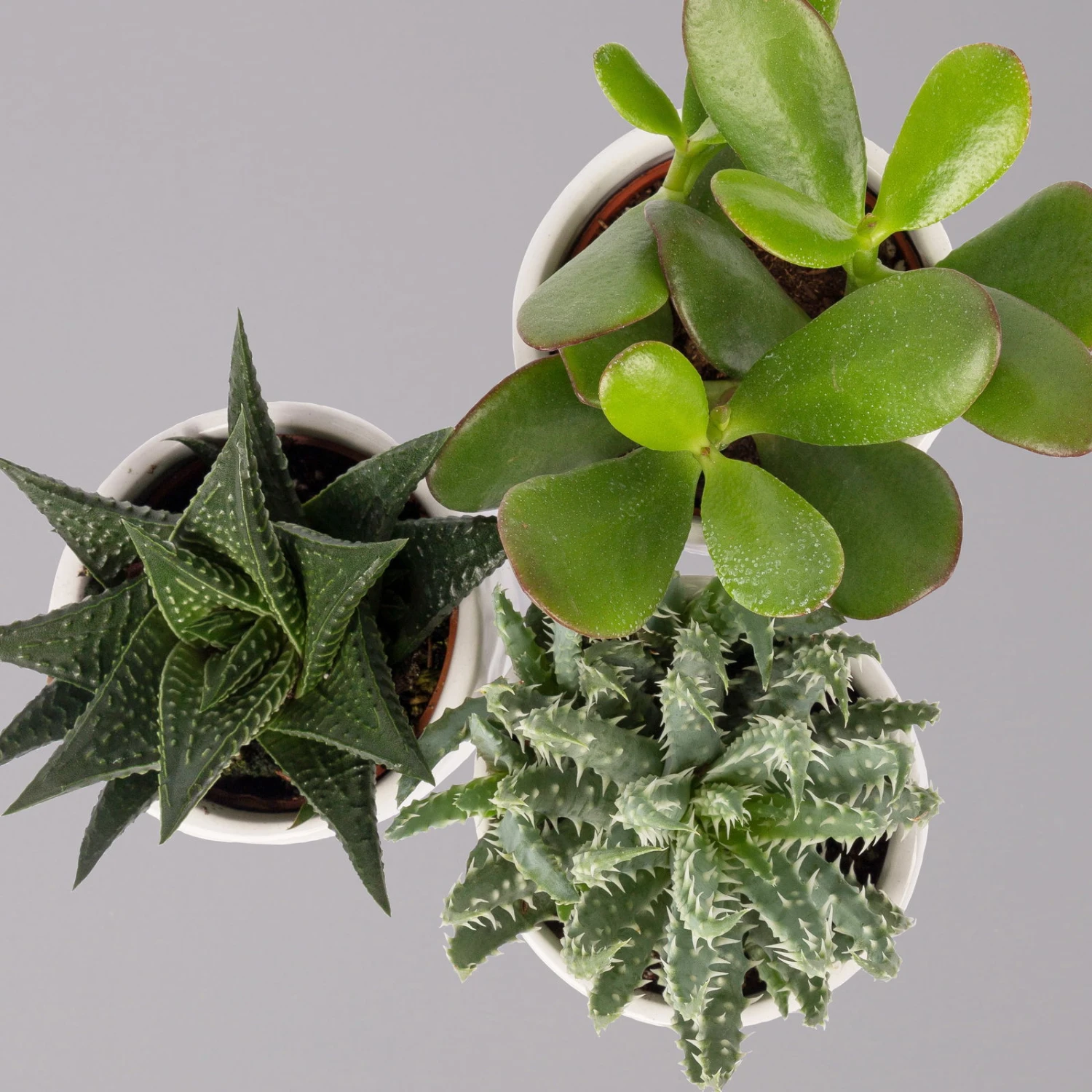 Falls Sie nach einer exotischen Begrünung für Ihr vollsonniges Südfenster suchen, dann bieten sich unsere Minisukkulenten in formschönen Dekotöpfen geradezu an. Diese sukkulenten Zimmerpflanzen sind ausgesprochen pflegeleicht und zeigen eine hohe Toleranz in Hinblick auf die Wassergaben. Lassen Sie das Substrat gründlich antrocknen, bevor Sie Ihre Mini-Sukkulenten wieder gießen. Eine gute Drainage ist für die Pflanzengesundheit entscheidend, daher eignet sich Kakteenerde für die Pflege der Pflanzen am besten. Im Sommer brauchen die Sukkulenten recht viel Wärme, sodass die Raumtemperaturen nicht unter 20 Grad Celsius fallen dürfen. In der kalten Jahreszeit reichen für das Wohlbefinden moderate zehn Grad Celsius aus. Daher sind unsere stylischen Mini-Sukkulenten zum Beispiel auch für einen beheizbaren Wintergarten die richtige Wahl.