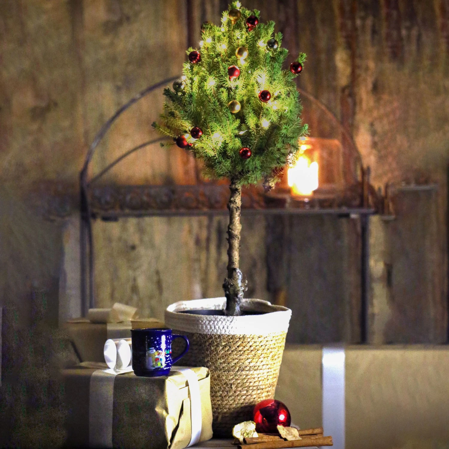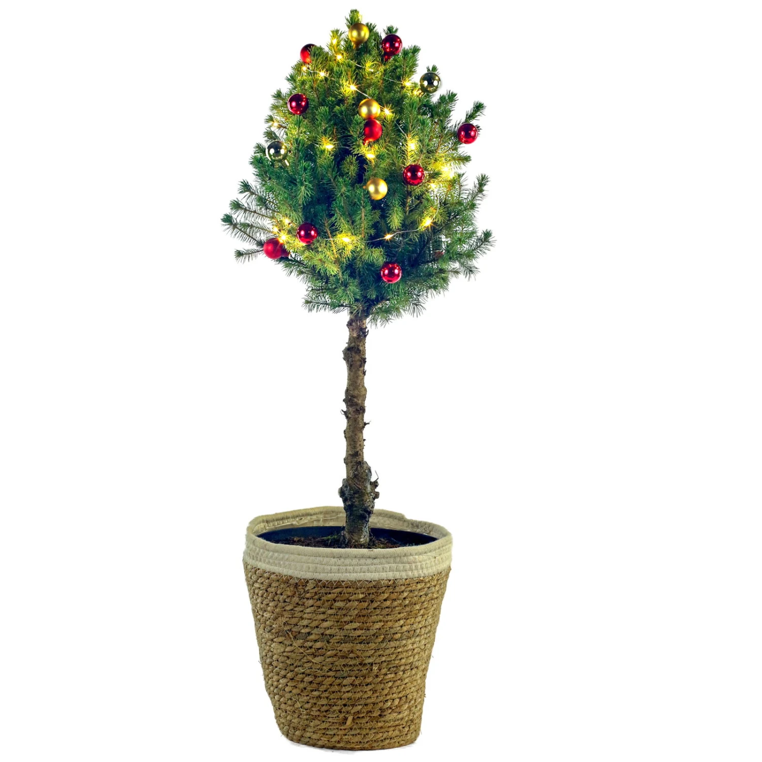 Dieses wunderschöne Stämmchen ist etwas ganz Besonderes in der Weihnachtszeit. Dekoriert mit kleinen Kugeln in den klassischen Farben Rot und Gold und einer Lichterkette für ein stimmungsvolles Ambiente in Ihrem Heim. Farblich dazu abgestimmt ein Jutesack mit rotem Rand für den Topf. Das Bäumchen kann nach der Weihnachtszeit ausgepflanzt werden.